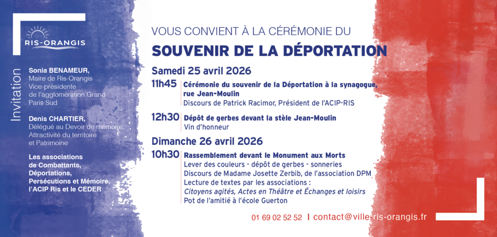 Sonia BENAMEUR, Maire de Ris-Orangis et Vice- présidente de l’agglomération Grand Paris Sud, ainsi que Denis CHARTIER, Délégué au Devoir de mémoire, attractivité du territoire et patrimoine en collaboration avec les associations de Combattants, Déportations, Persécutions et Mémoire, l’ACIP-Ris et le CEDER, vous invitent à honorer la mémoire des victimes de la Déportation lors de deux temps forts.