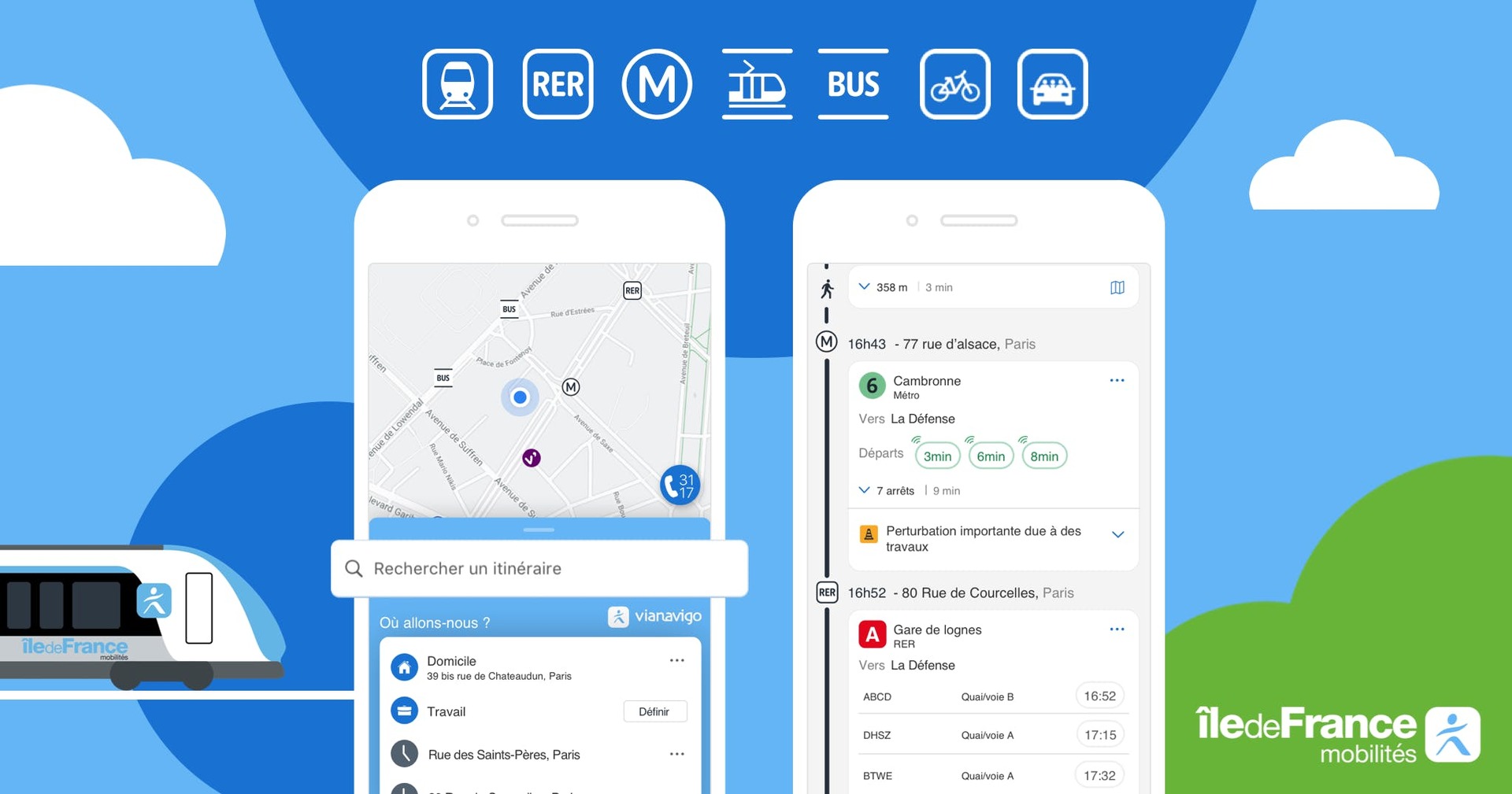 Vianavigo, site internet des transports d’Île-de-France (STIF) a vocation à vous faciliter la vie dans tous vos déplacements en bus, métro et RER, en vous informant sur tous les aménagements disponibles ainsi qu’en vous alertant sur les pannes des équipements du réseau pour vous éviter tout désagrément en cours de route. Site internet : vianavigo.com